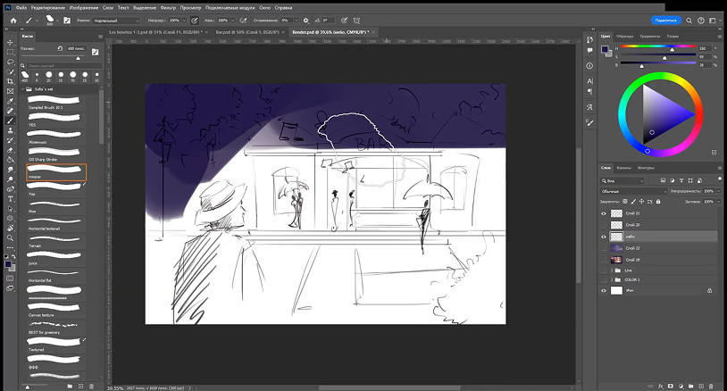 We shape the first tones and shadows. Here, the atmosphere begins to emerge.